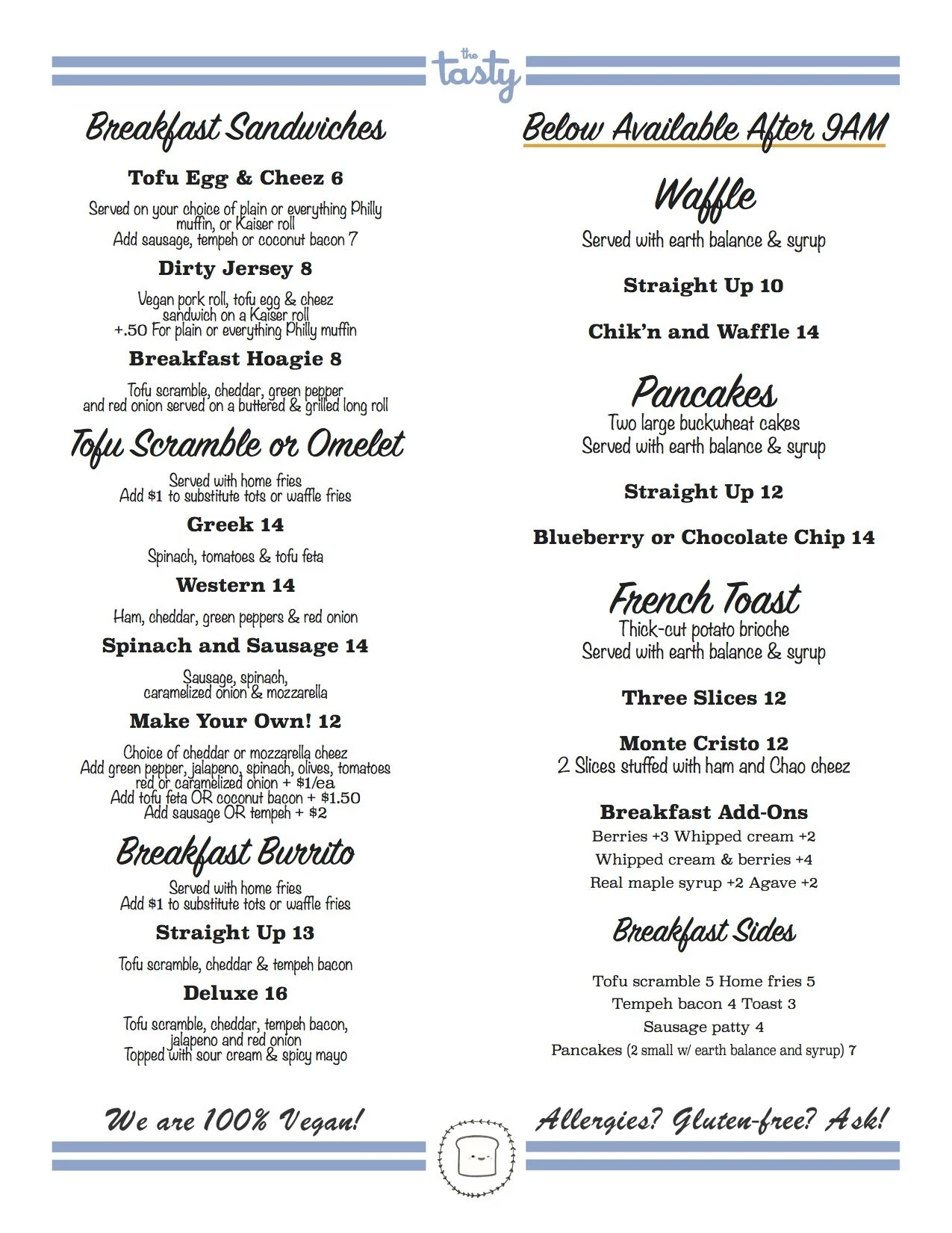 The Tasty is an all vegan diner located in South Philly. The vibe is that of a laid back old school diner. We have a rotating assortment of in house baked goods available daily (including donuts!). Our breakfast menu consists of many diner favorites, like pancakes, waffles, french toast, and tofu scrambles. We also offer some popular favorites like the deluxe burrito (tofu scramble, cheddar, tempeh bacon, red onion and jalapeño filled burrito topped with sour cream and spicy mayo) and the dirty jersey (tofu egg and cheese with vegan pork roll on a kaiser roll). Our lunch menu has cheesesteaks (make sure to try the buffalo chicken cheesesteak!), BLTs, salads, and more. We are a counter service only establishment that aims to have the relaxed feel of a friendly neighborhood spot.